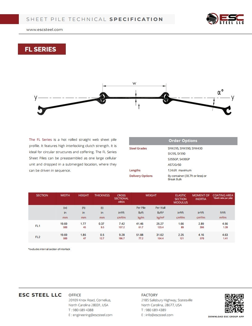 The FL series is a hot rolled straight web sheet pile profile. It features high interlocking clutch strength. It is ideal for circular structures and coffering. The FL Series Sheet Piles can be preassembled as one large cellular unit and dropped in a submerged location, where they can be driven in sequence.